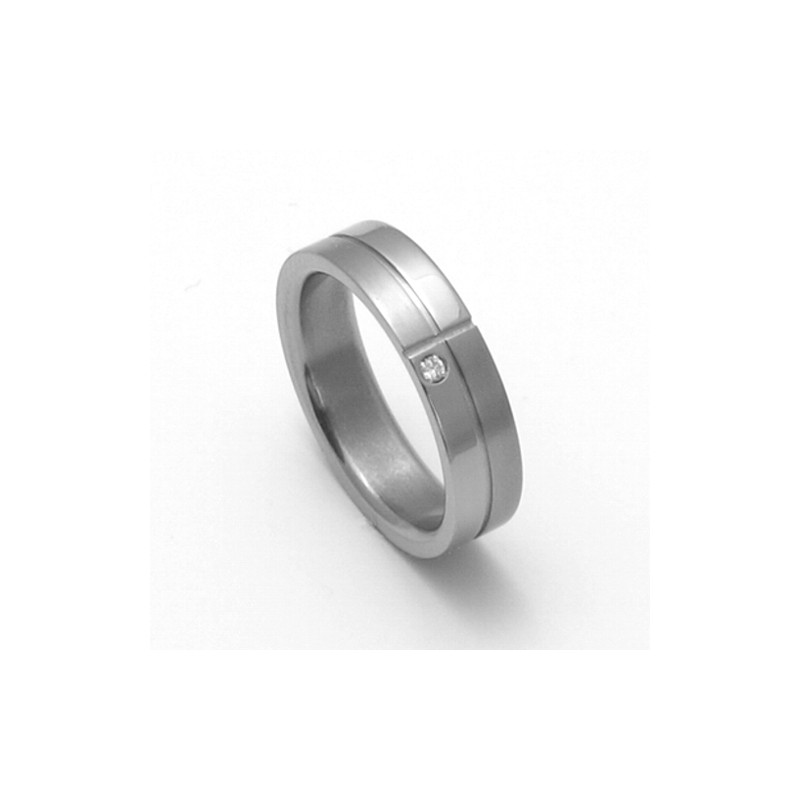Dámský snubní prsten z titanu s leštěnými a matovanými plochami oddělenými drážkami a s drobným zirkonem. Šperk dodáváme v originální krabičce od výrobce.