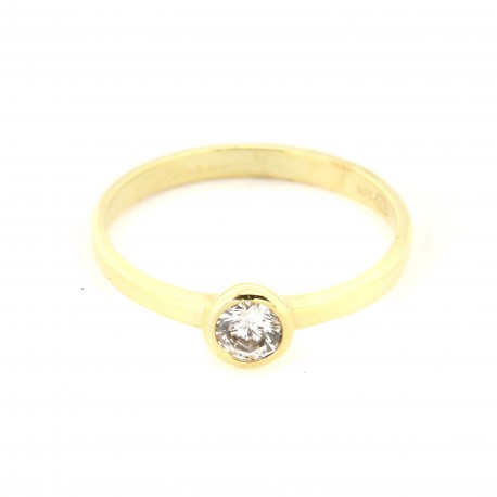 Elegantní prsten v podobě jednoduchého kroužku vyrobeného ze 14-ti karátového žlutého zlata a ozdobeného kubickým zirkonem. Zirkon je jedna z nejkvalitnějších imitací diamantu, má podobné optické vlastnosti a je velmi tvrdý. Šperk dodáváme na zakázku v různých velikostech (viz varianty níže).